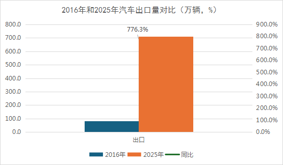出口量对比:2016年我国汽车出口量为81万辆, 2025年我国汽车出口量为710万辆,十年时间同比增长776.3%。