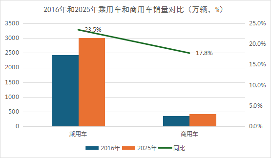 乘用车和商用车销量对比:2016年,我国乘用车销量2438万辆,商用车销量365万辆;2025年,我国乘用车销量3010万辆,商用车销量430万辆;十年时间,同比分别增长23.5%和17.8%。