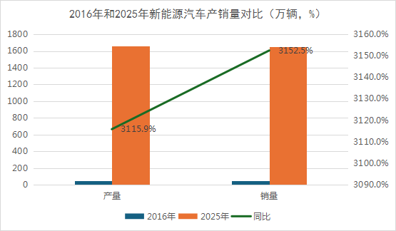 新能源汽车销量对比:2016年,我国新能源汽车产销量分别为51.7万辆和50.7万辆;2025年,我国新能源汽车产销量分别为1663万辆和1649万辆。十年时间,产销量同比分别增长3115.9%和3152.5%。