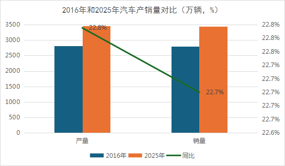 产销量对比:2016年,我国汽车产销量分别为2812万辆和2803万辆;2025年,我国汽车产销量分别为3453万辆和3440万辆。十年时间,产销量同比分别增长22.8%和22.7%。