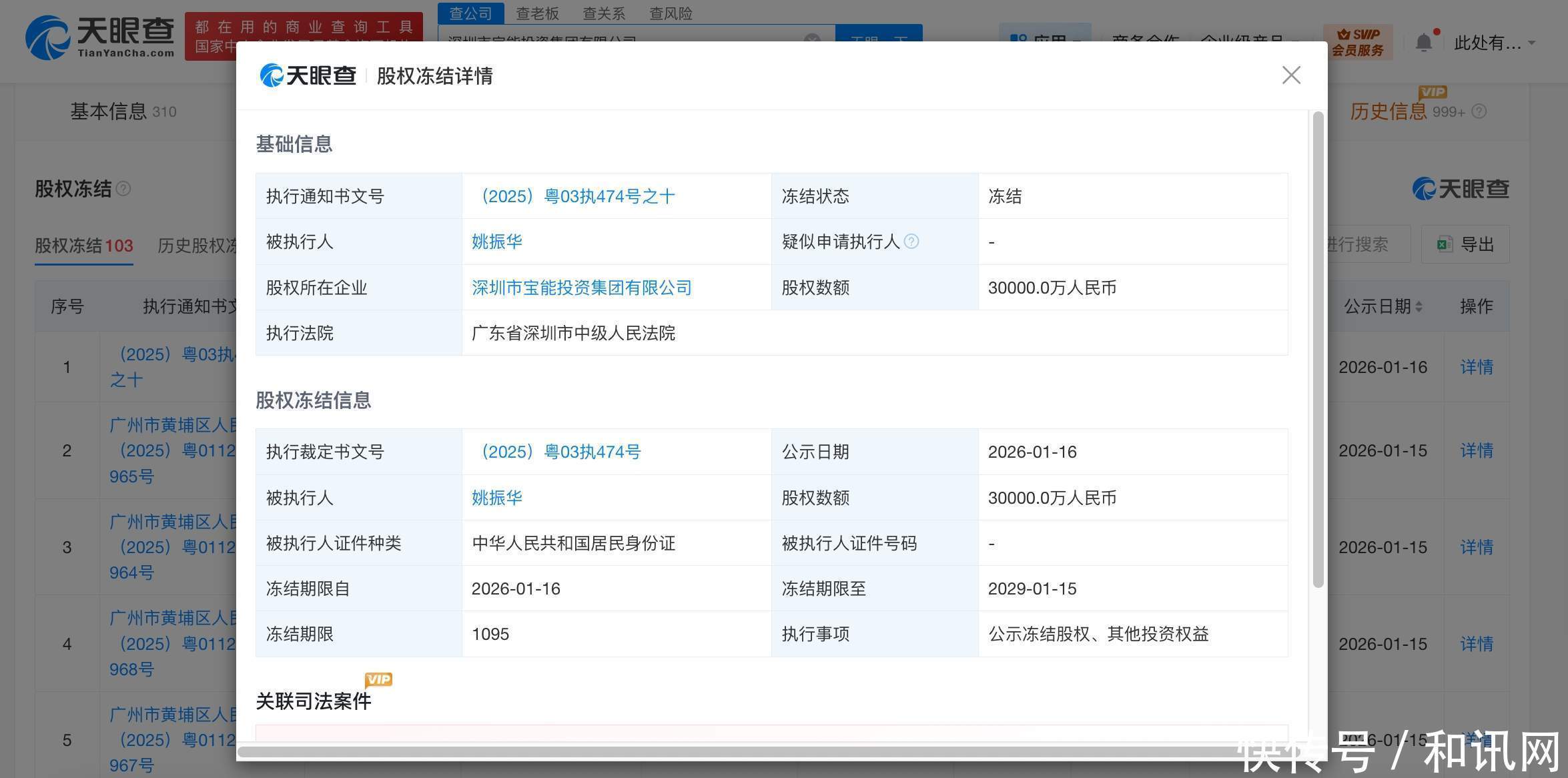 天眼查天眼风险信息显示,近日,姚振华新增一则股权冻结信息,股权所在企业为深圳市宝能投资集团有限公司,冻结股权数额3亿人民币,冻结期限自2026年1月16日至2029年1月15日,执行法院为广东省深圳市中级人民法院。