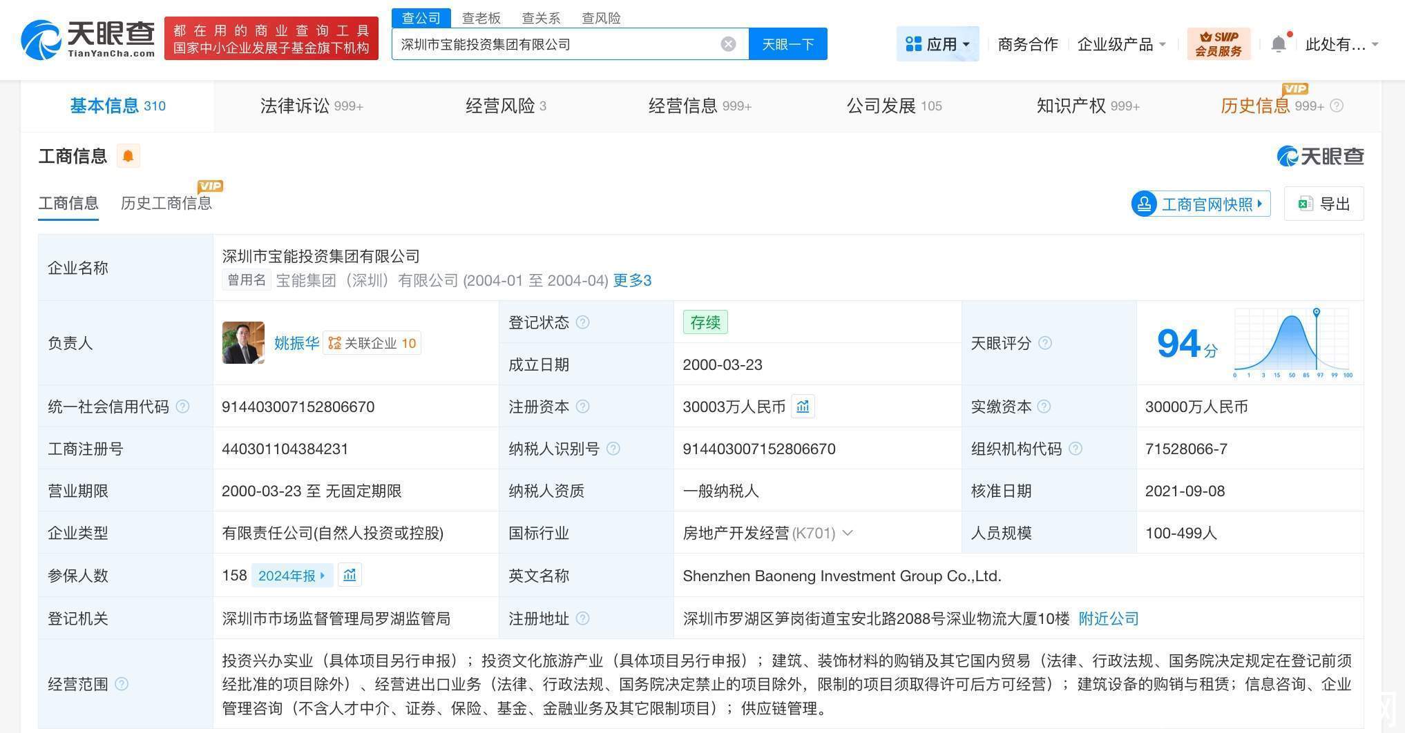 深圳市宝能投资集团有限公司成立于2000年3月,法定代表人为姚振华,注册资本约3亿人民币,经营范围含投资兴办实业、投资文化旅游产业、信息咨询、企业管理咨询等。股东信息显示,该公司由姚振华、深圳赛康资产管理有限公司共同持股。
