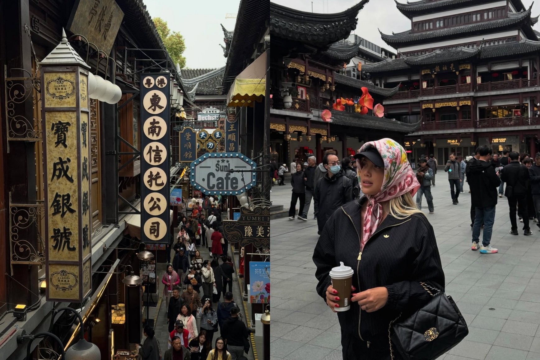 旺达在上海街头拍摄特色建筑和美食招牌,喝了星巴克手冲咖啡,并购买了香奈儿的奢侈品。