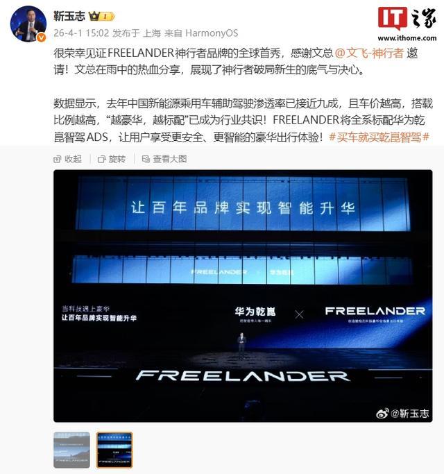 华为智能汽车解决方案 BU CEO 靳玉志今日发文谈及了 FREELANDER 神行者品牌的全球首秀。他分享了一条数据:去年中国新能源乘用车辅助驾驶渗透率已接近九成,且车价越高,搭载比例越高。