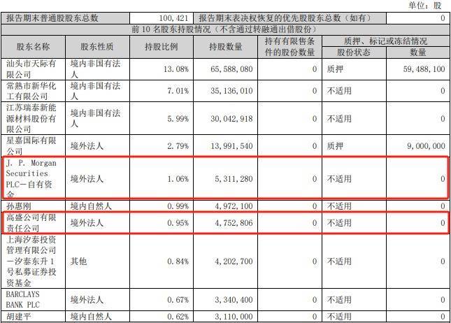 2025年三季度报告显示,J. P. Morgan Securities PLC-自有资金为公司第五大股东,持股数量5,311,280股,持股比例1.06%;高盛公司有限责任公司为公司第七大股东,持股数量4,752,806够,持股比例0.95%。