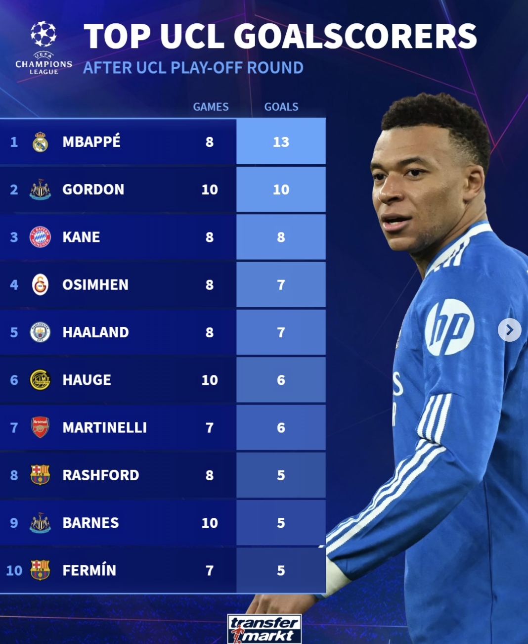 1. 姆巴佩(皇马):8场13球
