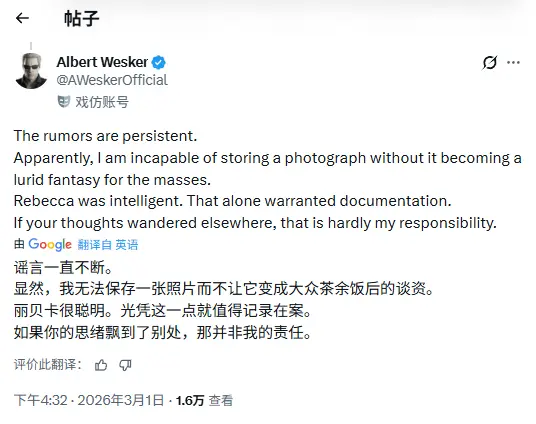 这一细节公开后迅速引发广大玩家热议。在评论区中,一位模仿威斯克的推特用户玩梗表示:“流言一直没有停止。显然,在别人看来,我似乎无法保存一张照片,而不让它变成大众眼中的低俗幻想。瑞贝卡很聪明,仅此一点,就值得被记录下来。如果你的想法偏向了别处,那可不关我的事。”
