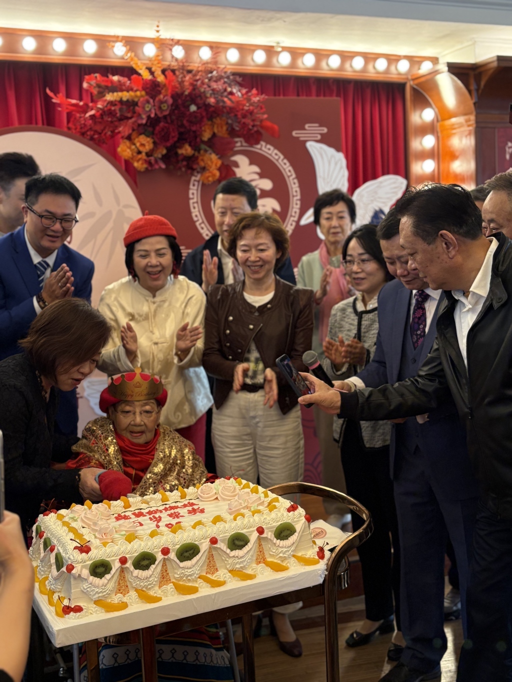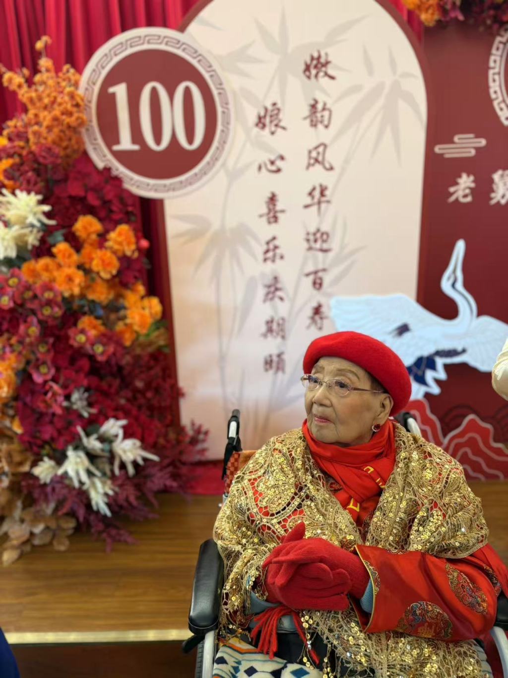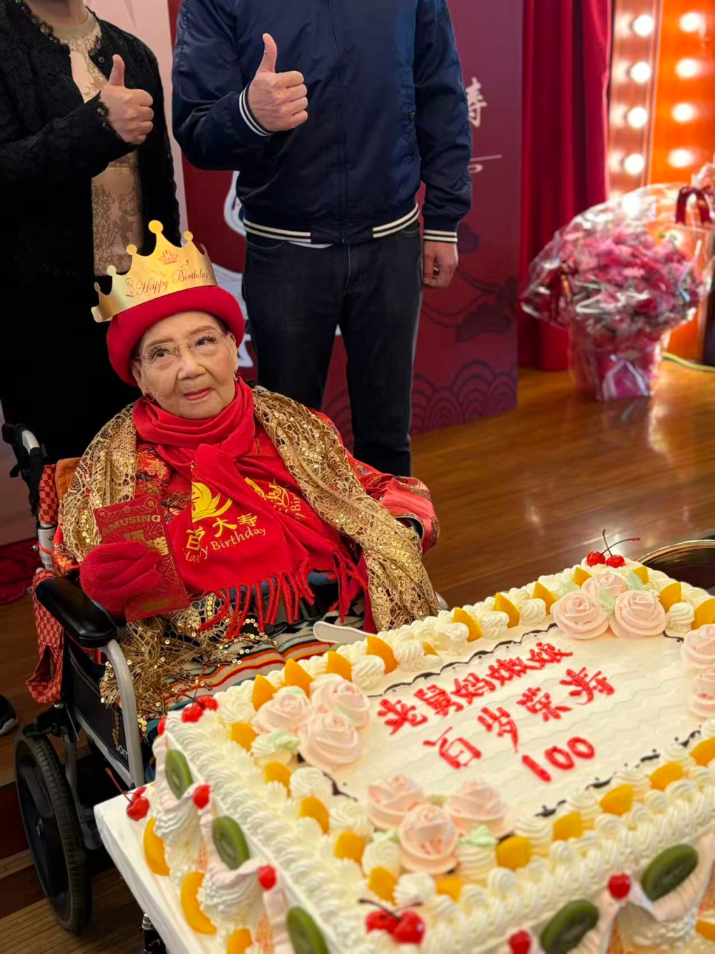 百岁高龄的嫩娘一身红色金色的喜庆装扮登场,脸色红润精神矍铄,而且思路清晰。在主持人让她说两句时,她声音清脆地回答:“亲爱的观众朋友,今朝来贺喜,交关谢谢!”同时还高声演唱了两句滑稽戏。在大家唱起生日歌的簇拥下,嫩娘亲手切生日寿糕,现场欢声笑语。