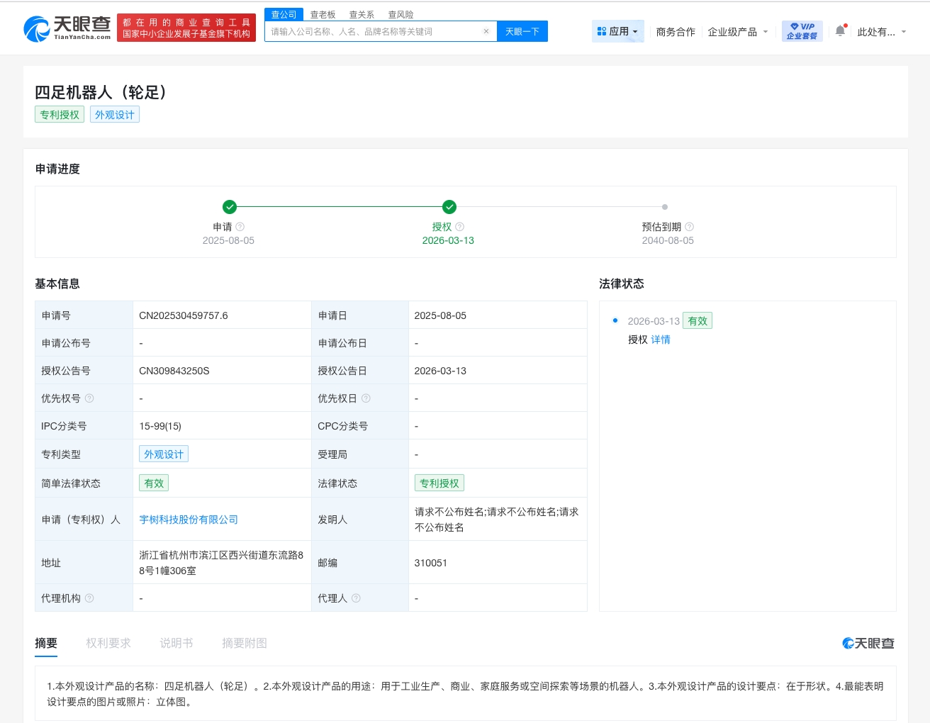 雷达财经讯,天眼查知识产权信息显示,近日,宇树科技股份有限公司申请的“四足机器人(轮足)”外观专利获授权。