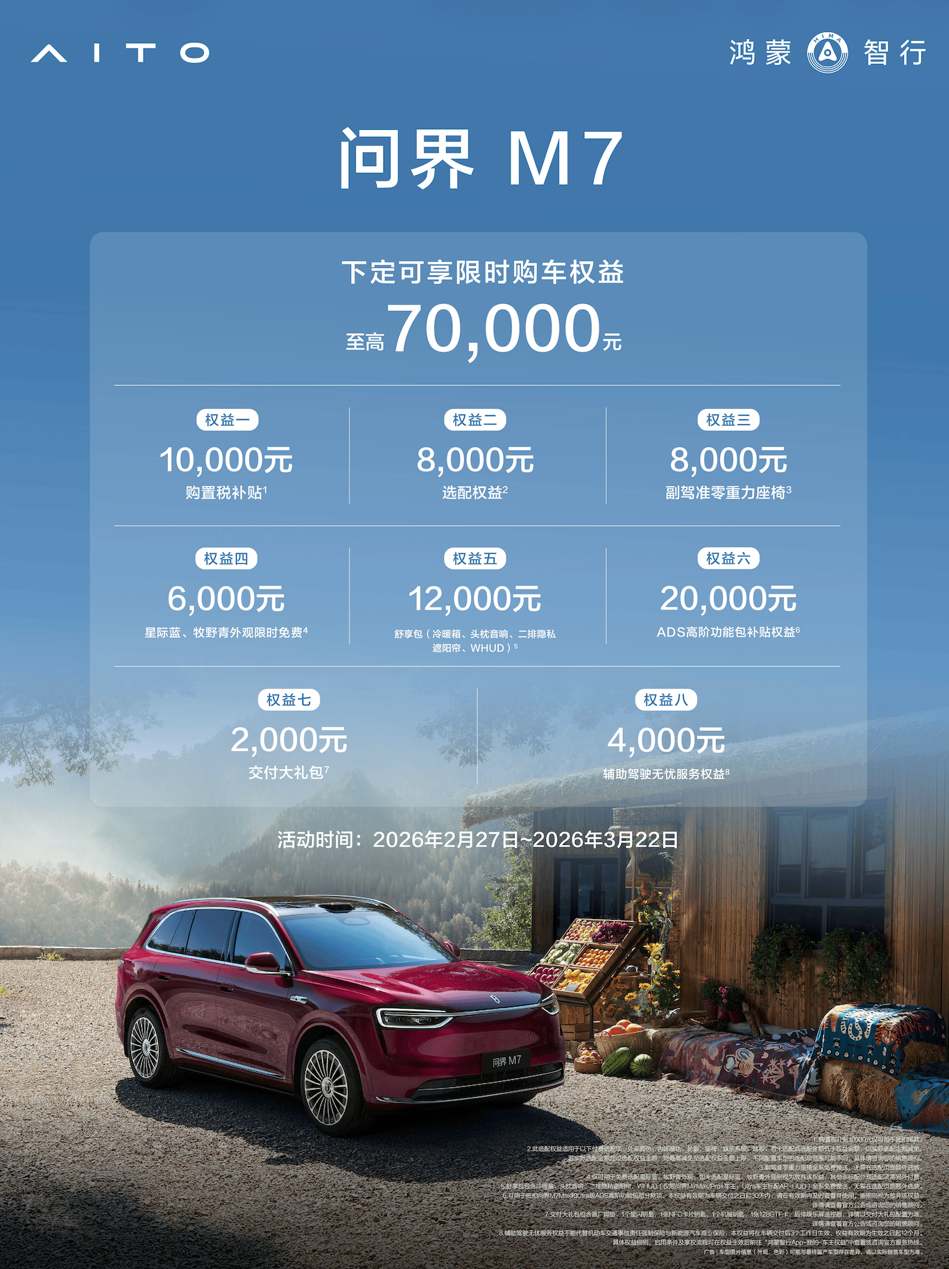 问界近日宣布推出一项限时专属购车权益,即日起至3月22日,消费者下定问界M7可享受最高7万元的购车优惠。这一举措旨在进一步激发市场对这款中大型SUV的关注,同时为潜在购车者提供更具吸引力的购车条件。